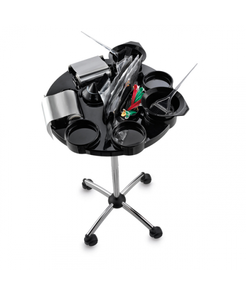 Тележка для окрашивания "TINTO" - из пластика на колесах. Имеет 5 отделений под миски для окрашивания, 5 отделений под кисти, 2 держателя с резаком для фольги, отделение для таймера TIMER DRINN и контейнер для сопутствующих аксессуаров.