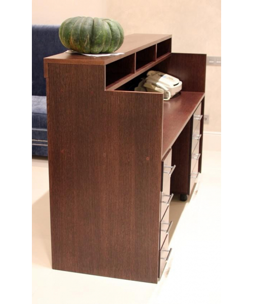 Парикмахерская стойка администратора (ресепшн) FLEURE SOFT для салона красоты. Удобная стойка для администратора салона. Массивный ресепшн, выполненный из шпонированной ДСП с состаренным зеркалом на передей панели.