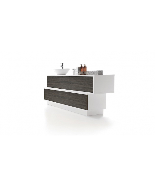 Это универсальный предмет мебели, который отлично впишется в любой интерьер. Модель выполнена из глянцевых меламиновых плит белого цвета. Выдвижные ящики изготовлены из натуральной древесины. Производитель предлагает несколько вариантов исполнения – натуральный венге, белая лиственница, дуб бардолино. Дополнительно мебель может комплектоваться раковиной со смесителем из хромированной стали. Ящики могут располагаться друг над другом или же быть смещенными относительно центра. Этот вариант мебели можно установить в любом СПА-салоне или салоне красоты.
