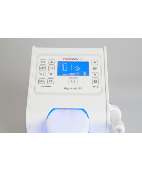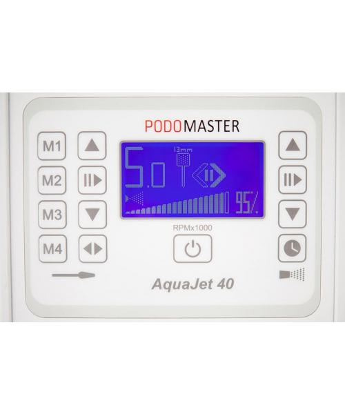 Профессиональный аппарат для педикюра "Podomaster AquaJet 40" оснащен мощным спреем. Мощность микромотора в наконечнике модели — 100 Вт, а скорость вращения составляет 40 000 об/мин. Устройство оснащено спреем со специальной легкосъемной емкостью для жидкости. Аппарат имеет большой информативный экран и оборудован ультралегким наконечником с бесщеточным мотором, который можно закрепить в специальном боковом держателе на корпусе.