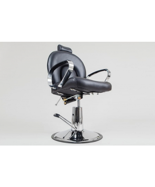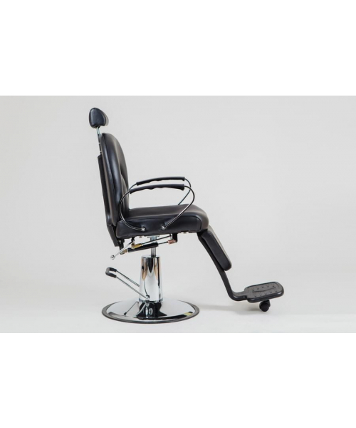 Если вы позиционируете свой салон как место премиум-класса, то обязательно обратите внимание на это мужское парикмахерское кресло. Стильное, мощное, с удобной подножкой — внимание! —на дополнительном роликовом колесе. Съемная подножка черного цвета с колесиком позволит поворачивать кресло вместе с клиентом. Эргономичная спинка интересного дизайна, небольшой подголовник, регулируемый по высоте, черная эко-кожа… всё, как любят мужчины! Крепкое хромированное основание и гидроподъемник завершают этот брутальный образ. А еще у этого кресла регулируется угол наклона спинки. Кто устал — может отдохнуть. Основание: хромированный круг. Подъёмник: гидравлический, хромированный.
